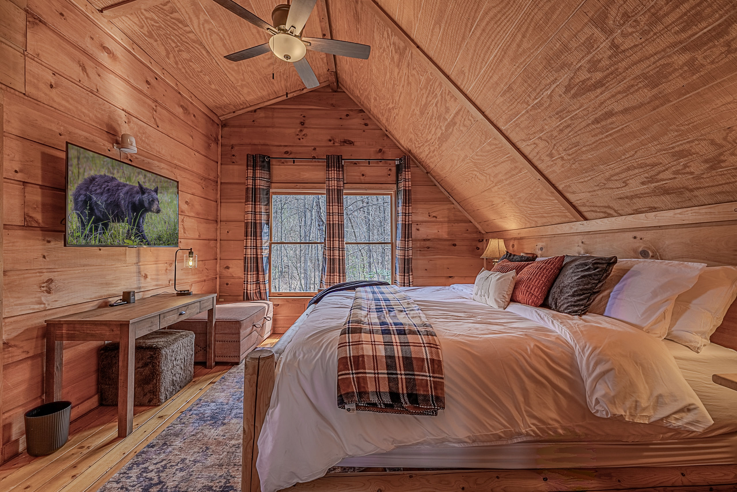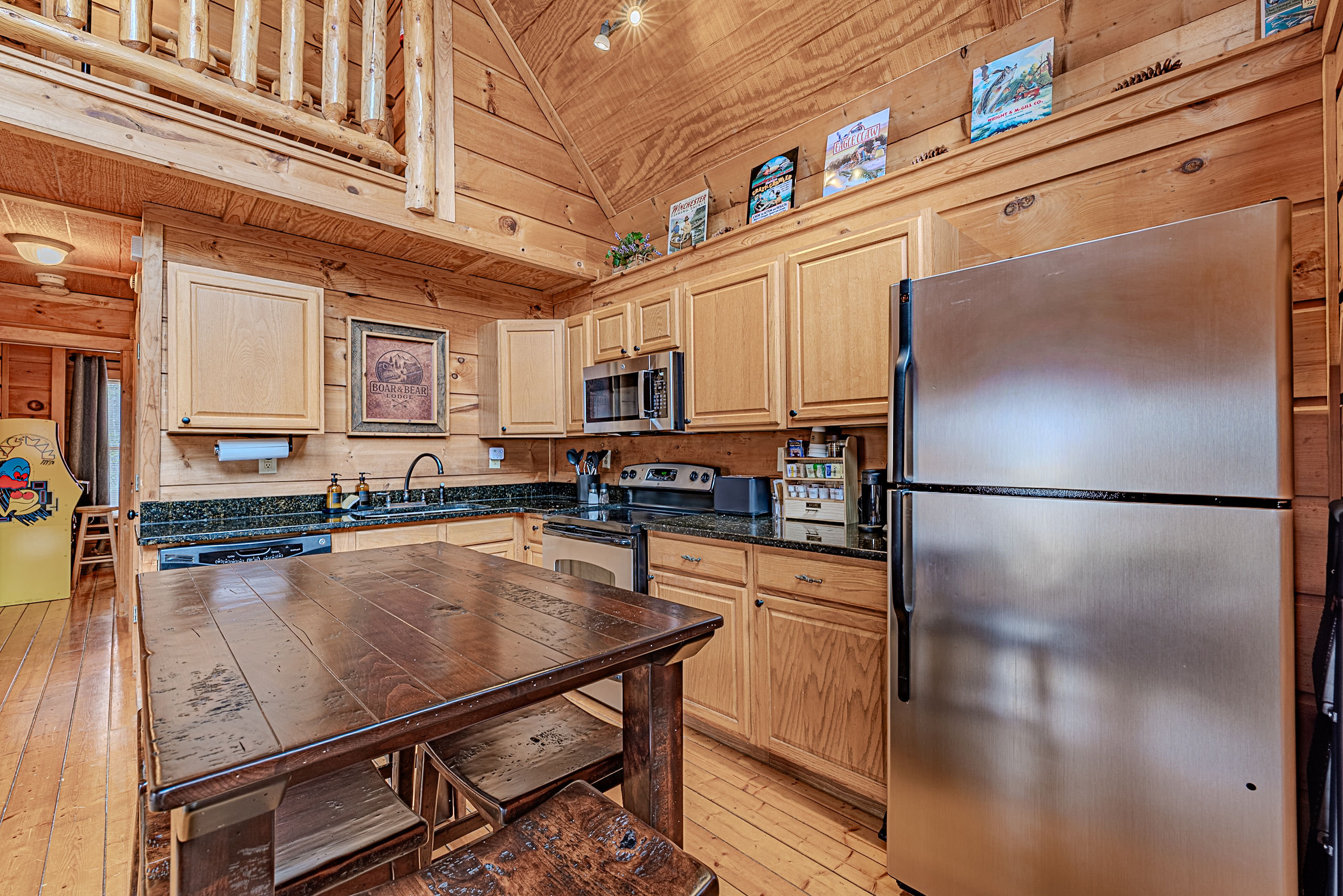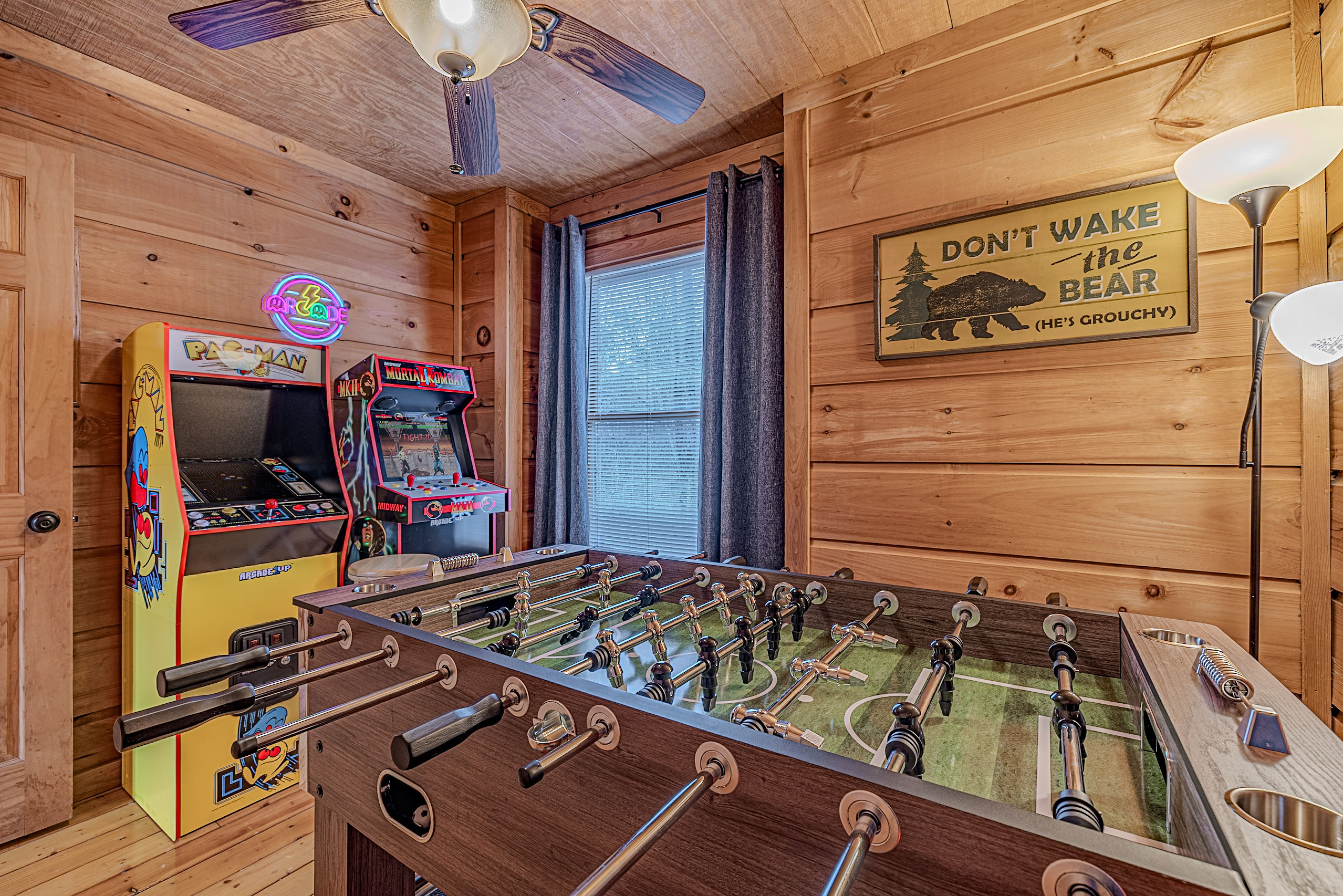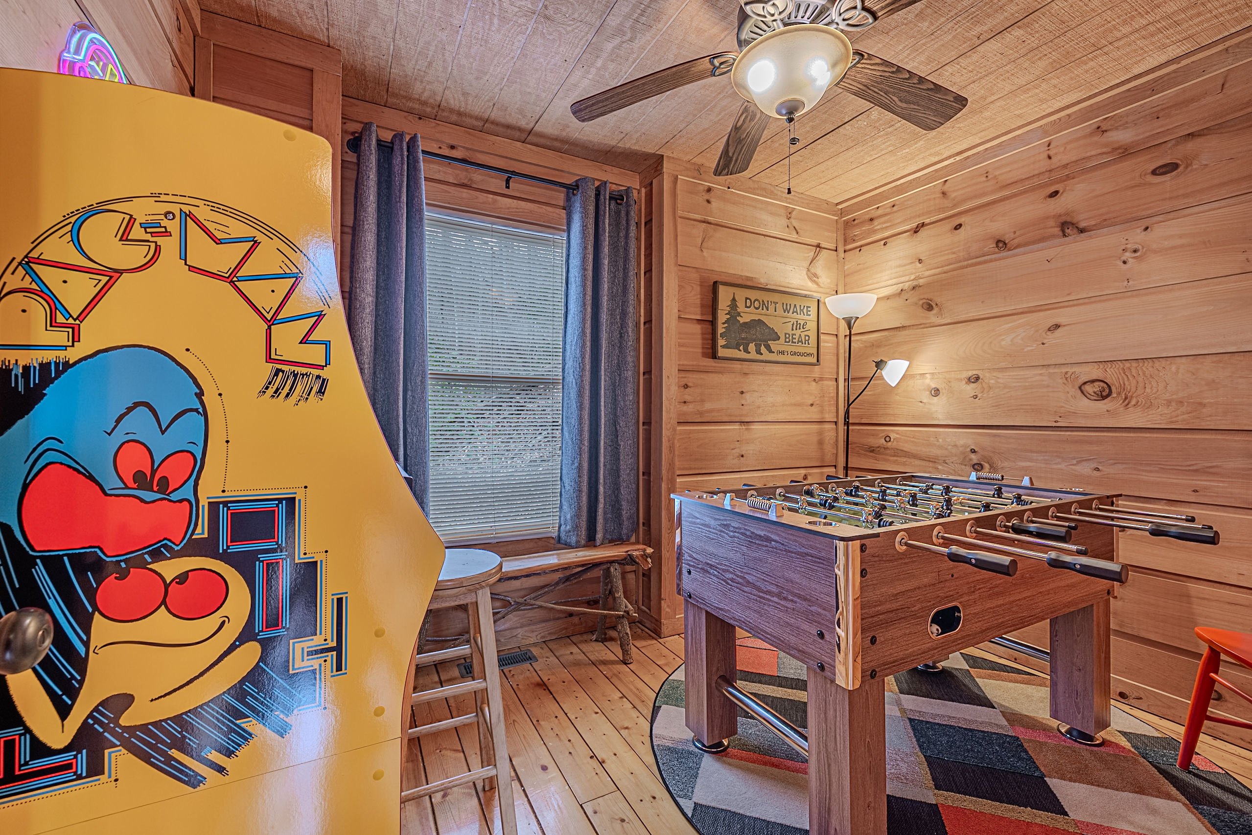 Welcome to Boar & Bear Lodge a thoughtfully designed 2-bedroom, 2-bath cabin that blends comfort, entertainment, and a peaceful mountain setting with access to Dollywood and the Parkway. The cabin is laid out across two levels, offering both space and privacy. Upstairs, the master bedroom features a king bed, TV, and a fold-out sleeper ottoman. The downstairs bedroom includes a queen bed and its own TV, providing a comfortable retreat for guests. The main living area offers a full-sized sleeper sofa making it perfect for families or flexible group stays, complete with a firebox, Smart TV, and high-speed WiFi. The fully stocked kitchen and coffee bar make it easy to cook meals or start your morning right with a Keurig, drip coffee maker, French press, and complimentary starter supplies. For fun and entertainment, enjoy the game area with foosball table and retro arcade machines—perfect for unwinding after a day of exploring. Step outside onto the private deck and take in the peaceful wooded surroundings. Relax in the hot tub under ambient lighting, or gather around the propane fire pit for a laid-back evening. The deck also features a bar rail—ideal for morning coffee or evening drinks. While there are neighboring cabins in the area, the layout and wooded setting provide a private, tucked-away feel, allowing you to enjoy the quiet without being completely remote. Additional conveniences include washer/dryer, workspace, keyless entry, and dedicated parking to make your stay as easy and comfortable as possible.