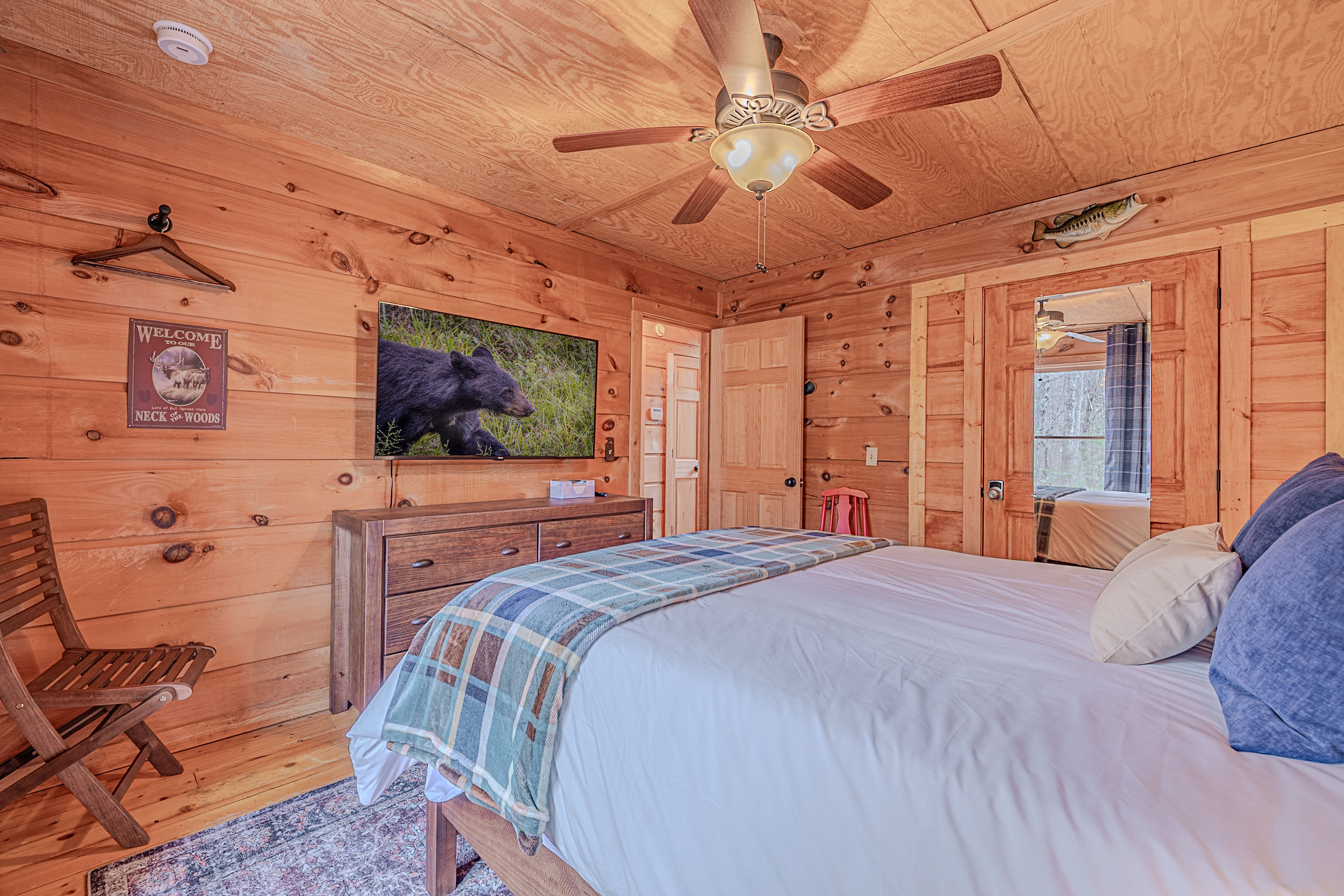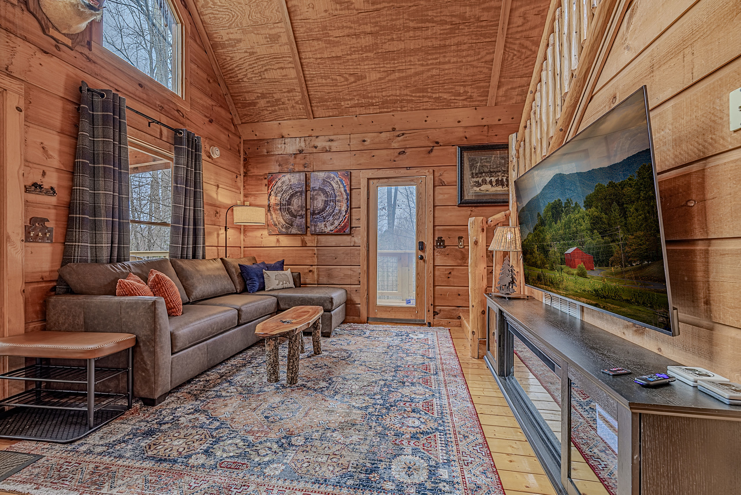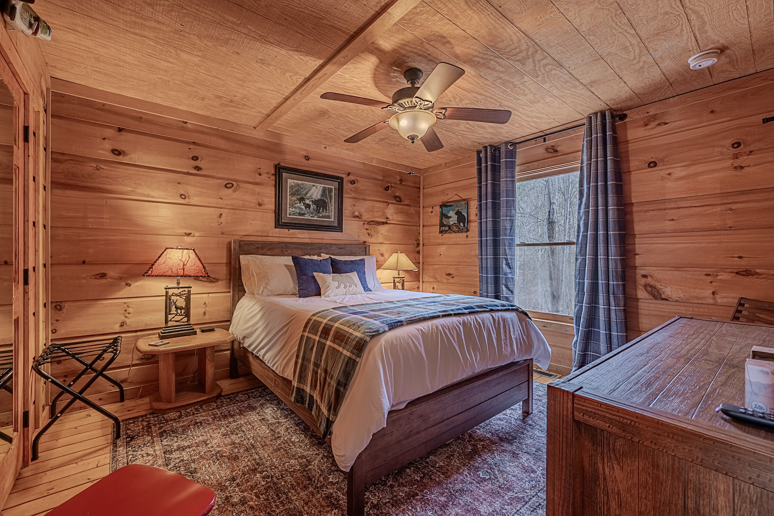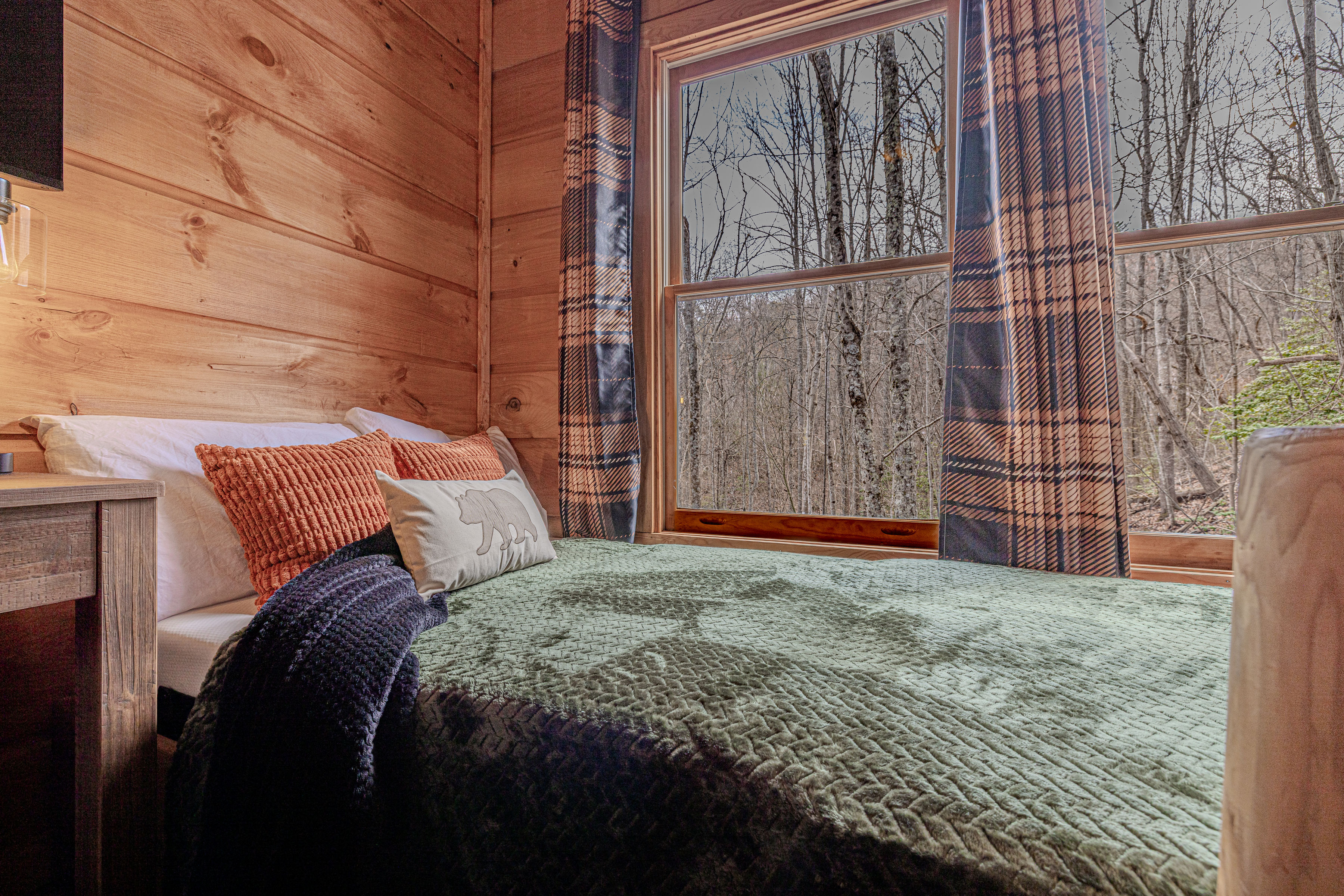 Welcome to Boar & Bear Lodge a thoughtfully designed 2-bedroom, 2-bath cabin that blends comfort, entertainment, and a peaceful mountain setting with access to Dollywood and the Parkway. The cabin is laid out across two levels, offering both space and privacy. Upstairs, the master bedroom features a king bed, TV, and a fold-out sleeper ottoman. The downstairs bedroom includes a queen bed and its own TV, providing a comfortable retreat for guests. The main living area offers a full-sized sleeper sofa making it perfect for families or flexible group stays, complete with a firebox, Smart TV, and high-speed WiFi. The fully stocked kitchen and coffee bar make it easy to cook meals or start your morning right with a Keurig, drip coffee maker, French press, and complimentary starter supplies. For fun and entertainment, enjoy the game area with foosball table and retro arcade machines—perfect for unwinding after a day of exploring. Step outside onto the private deck and take in the peaceful wooded surroundings. Relax in the hot tub under ambient lighting, or gather around the propane fire pit for a laid-back evening. The deck also features a bar rail—ideal for morning coffee or evening drinks. While there are neighboring cabins in the area, the layout and wooded setting provide a private, tucked-away feel, allowing you to enjoy the quiet without being completely remote. Additional conveniences include washer/dryer, workspace, keyless entry, and dedicated parking to make your stay as easy and comfortable as possible.