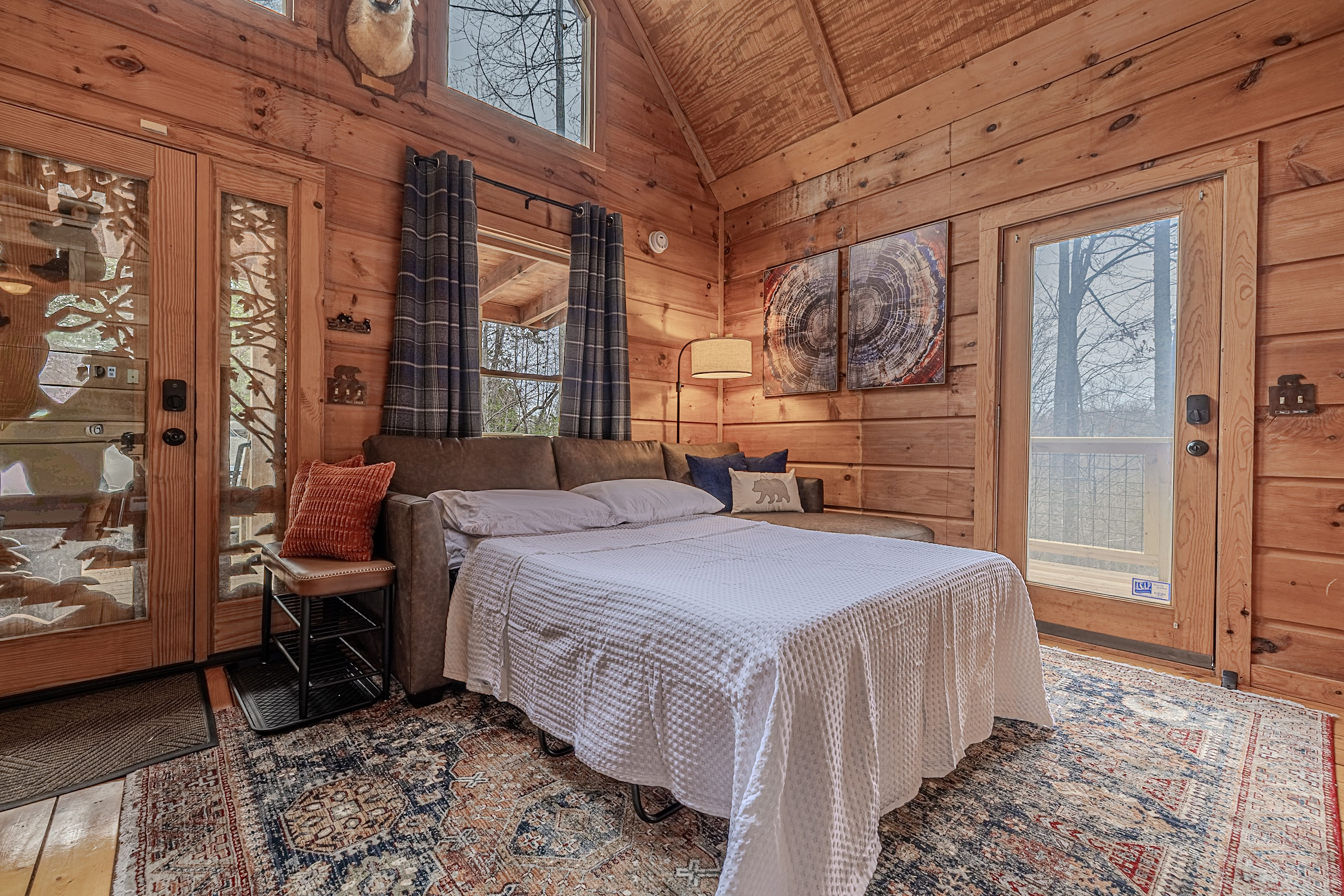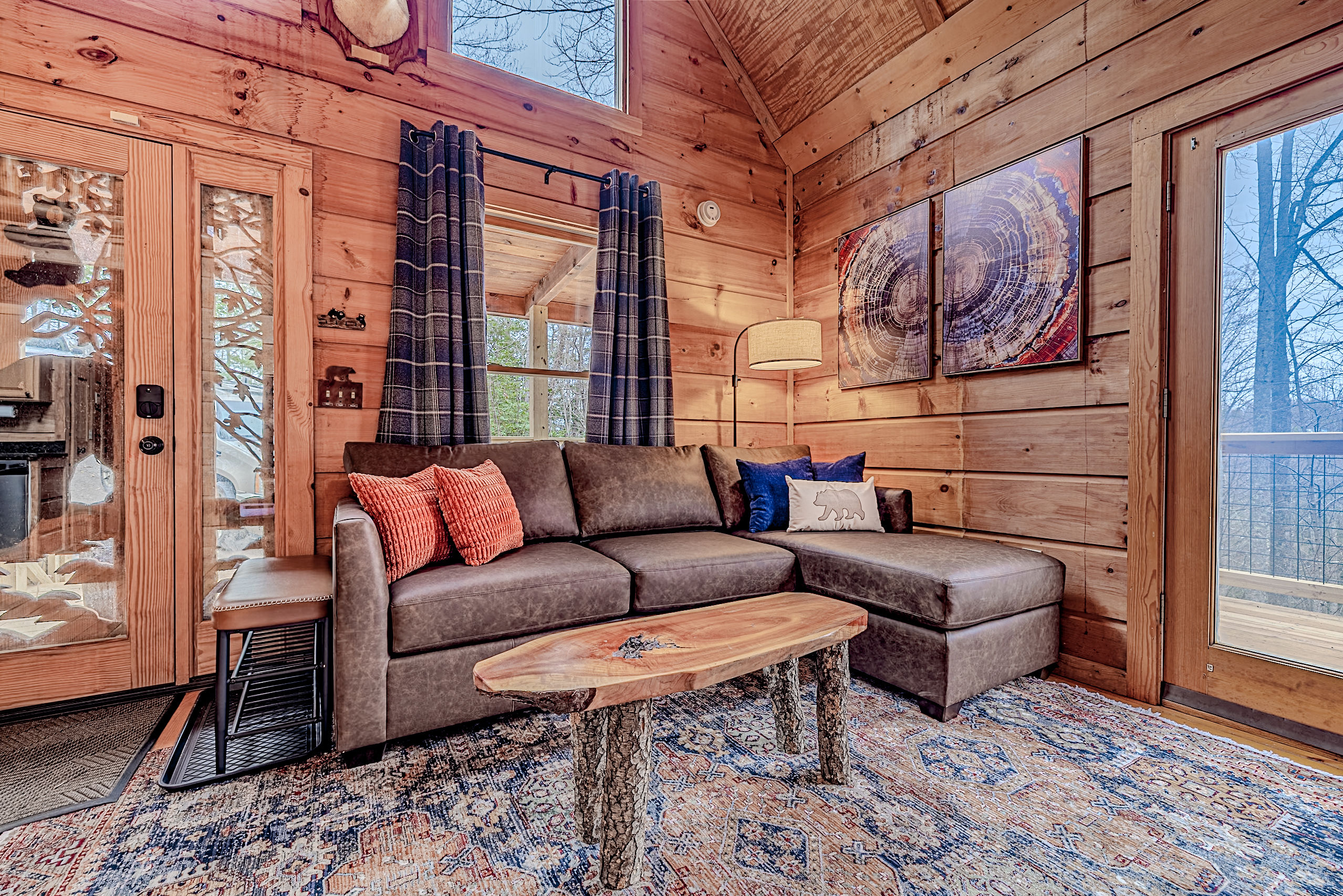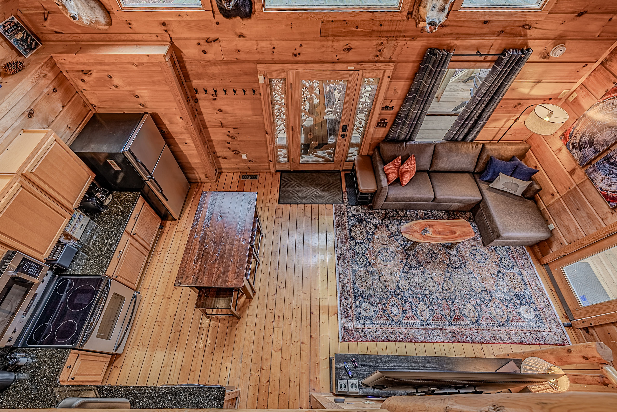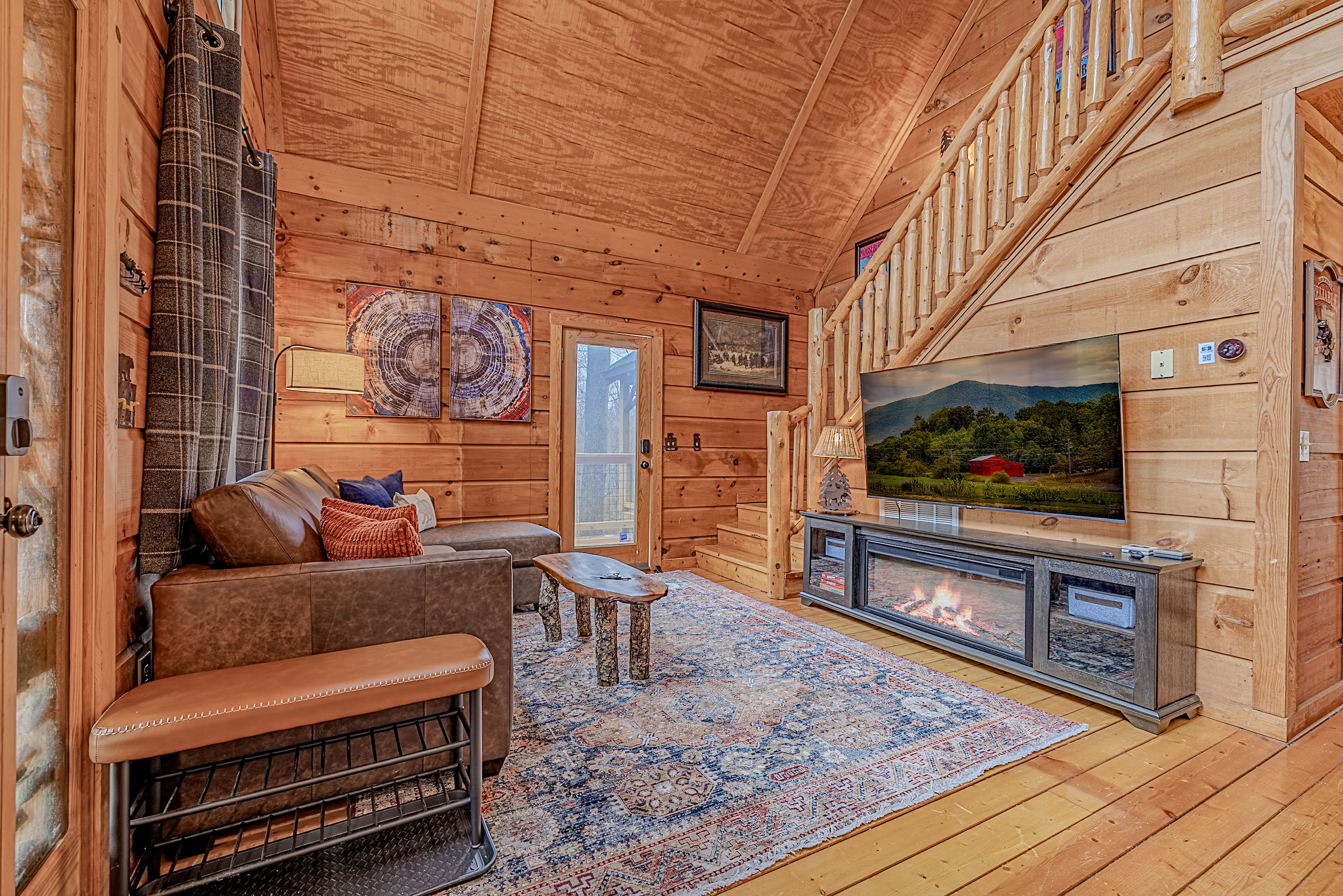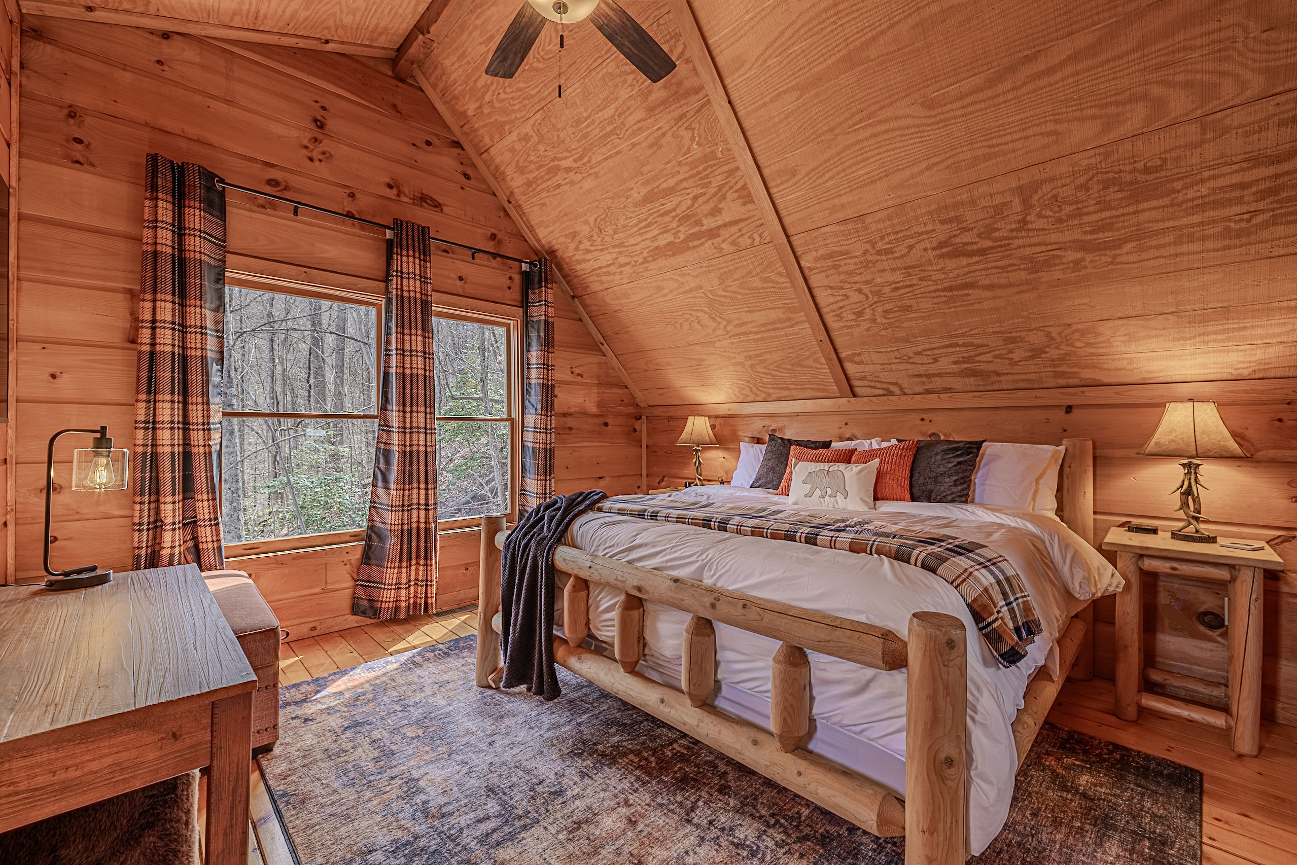 Welcome to Boar & Bear Lodge a thoughtfully designed 2-bedroom, 2-bath cabin that blends comfort, entertainment, and a peaceful mountain setting with access to Dollywood and the Parkway. The cabin is laid out across two levels, offering both space and privacy. Upstairs, the master bedroom features a king bed, TV, and a fold-out sleeper ottoman. The downstairs bedroom includes a queen bed and its own TV, providing a comfortable retreat for guests. The main living area offers a full-sized sleeper sofa making it perfect for families or flexible group stays, complete with a firebox, Smart TV, and high-speed WiFi. The fully stocked kitchen and coffee bar make it easy to cook meals or start your morning right with a Keurig, drip coffee maker, French press, and complimentary starter supplies. For fun and entertainment, enjoy the game area with foosball table and retro arcade machines—perfect for unwinding after a day of exploring. Step outside onto the private deck and take in the peaceful wooded surroundings. Relax in the hot tub under ambient lighting, or gather around the propane fire pit for a laid-back evening. The deck also features a bar rail—ideal for morning coffee or evening drinks. While there are neighboring cabins in the area, the layout and wooded setting provide a private, tucked-away feel, allowing you to enjoy the quiet without being completely remote. Additional conveniences include washer/dryer, workspace, keyless entry, and dedicated parking to make your stay as easy and comfortable as possible.
