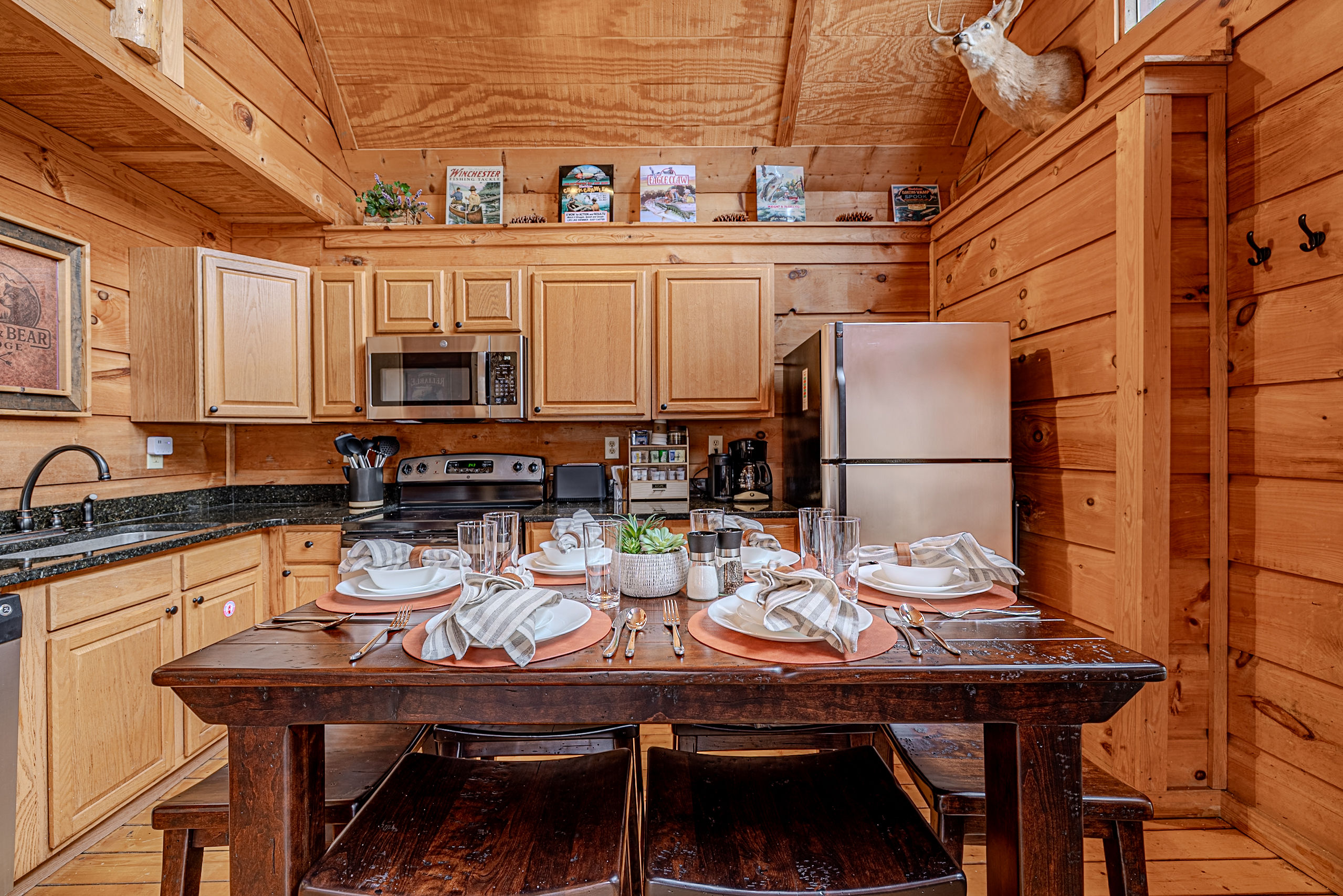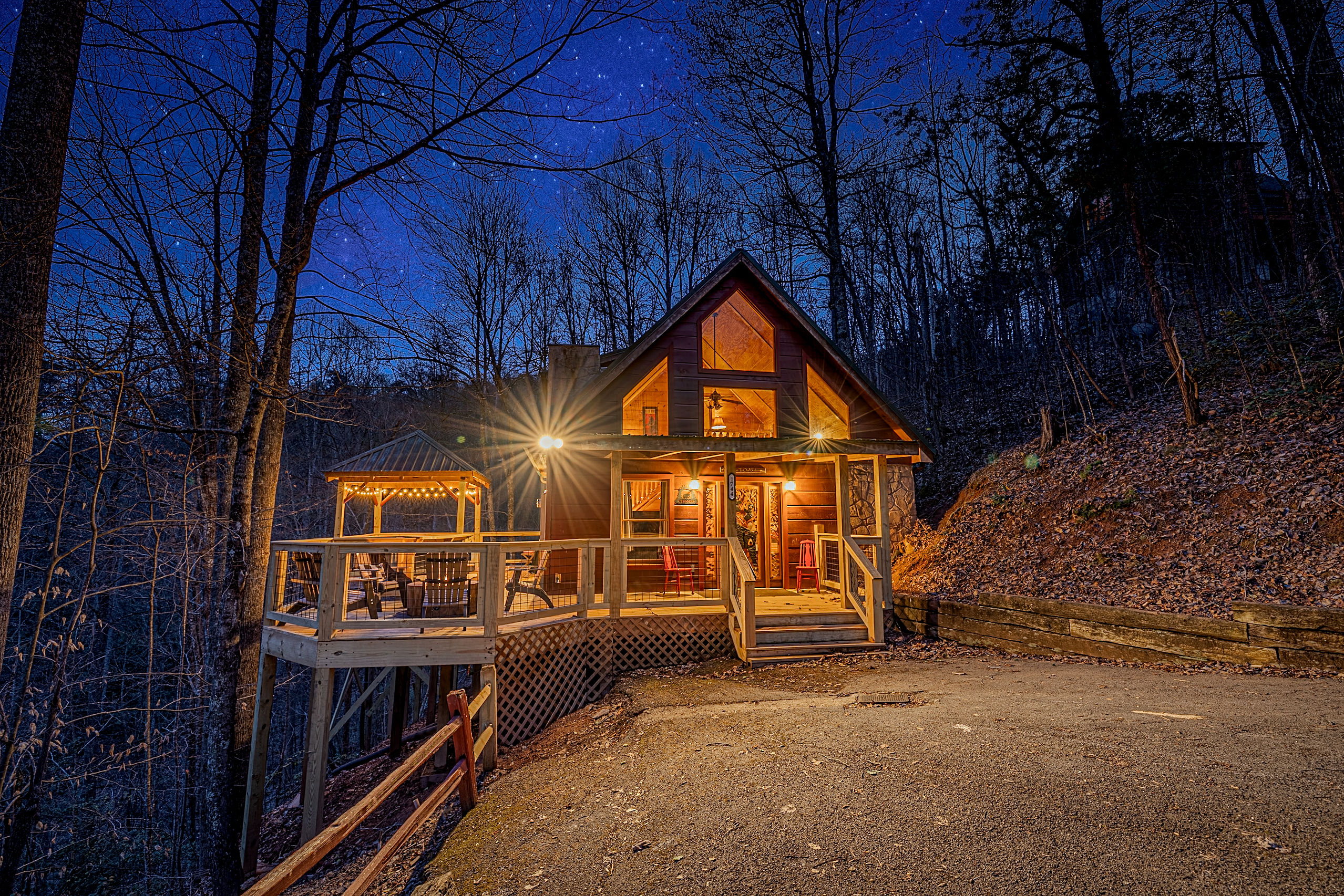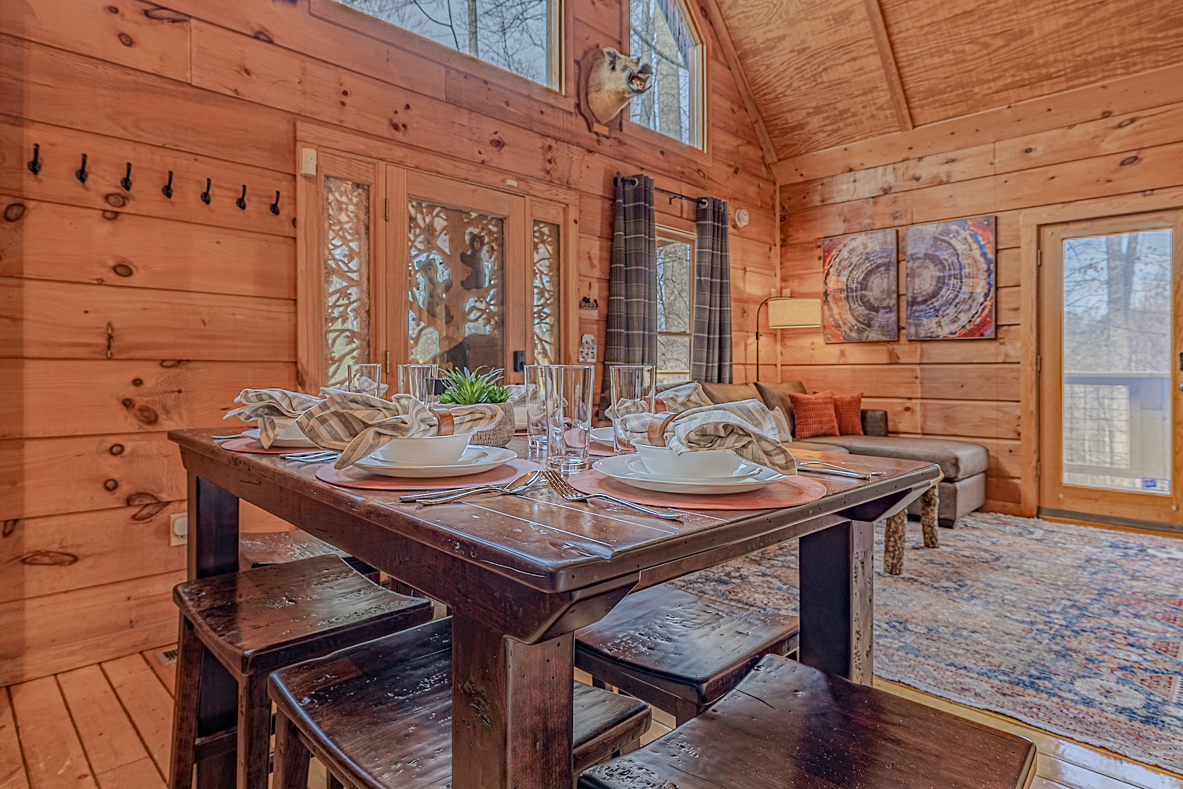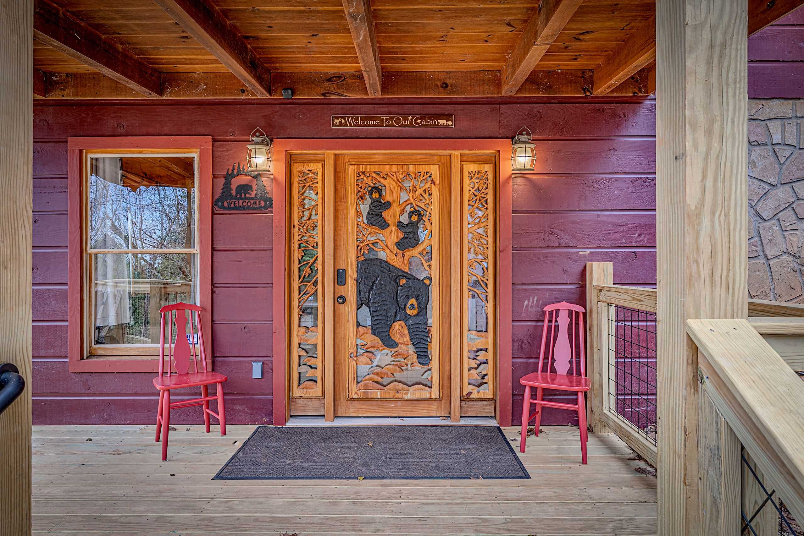 Welcome to Boar & Bear Lodge a thoughtfully designed 2-bedroom, 2-bath cabin that blends comfort, entertainment, and a peaceful mountain setting with access to Dollywood and the Parkway. The cabin is laid out across two levels, offering both space and privacy. Upstairs, the master bedroom features a king bed, TV, and a fold-out sleeper ottoman. The downstairs bedroom includes a queen bed and its own TV, providing a comfortable retreat for guests. The main living area offers a full-sized sleeper sofa making it perfect for families or flexible group stays, complete with a firebox, Smart TV, and high-speed WiFi. The fully stocked kitchen and coffee bar make it easy to cook meals or start your morning right with a Keurig, drip coffee maker, French press, and complimentary starter supplies. For fun and entertainment, enjoy the game area with foosball table and retro arcade machines—perfect for unwinding after a day of exploring. Step outside onto the private deck and take in the peaceful wooded surroundings. Relax in the hot tub under ambient lighting, or gather around the propane fire pit for a laid-back evening. The deck also features a bar rail—ideal for morning coffee or evening drinks. While there are neighboring cabins in the area, the layout and wooded setting provide a private, tucked-away feel, allowing you to enjoy the quiet without being completely remote. Additional conveniences include washer/dryer, workspace, keyless entry, and dedicated parking to make your stay as easy and comfortable as possible.